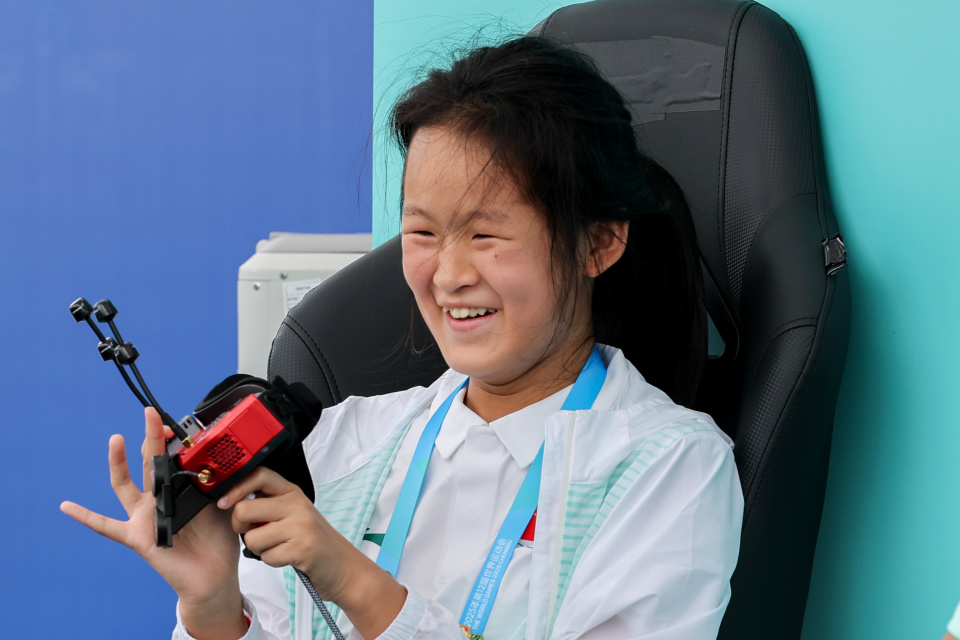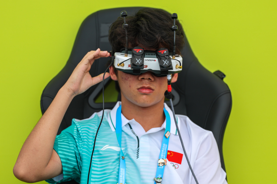 8月14日,中国选手黄悦祺在无人机竞速资格赛第二轮比赛前进行准备。新华社记者 李博 摄
