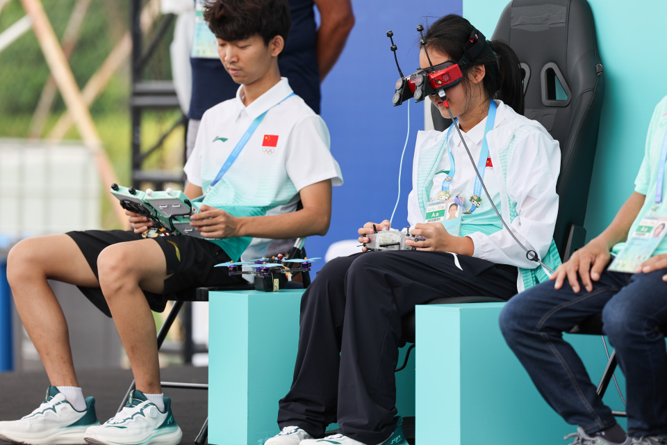 8月14日,中国选手李甜星(右)在无人机竞速资格赛第二轮比赛中。新华社记者 李博 摄