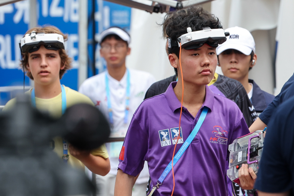 8月14日,中国香港选手关竣仁在无人机竞速资格赛第二轮比赛中。新华社记者 李博 摄